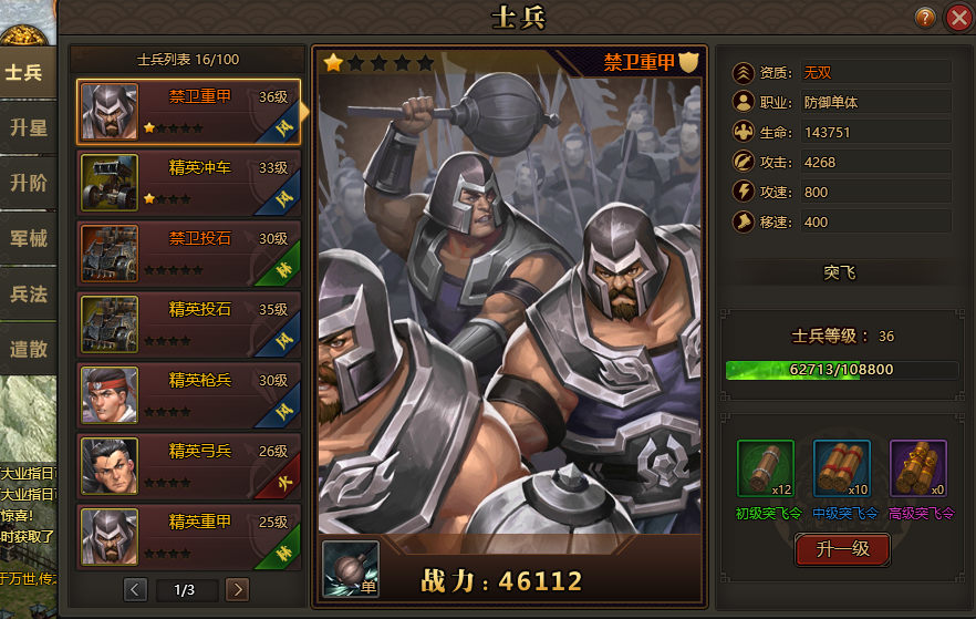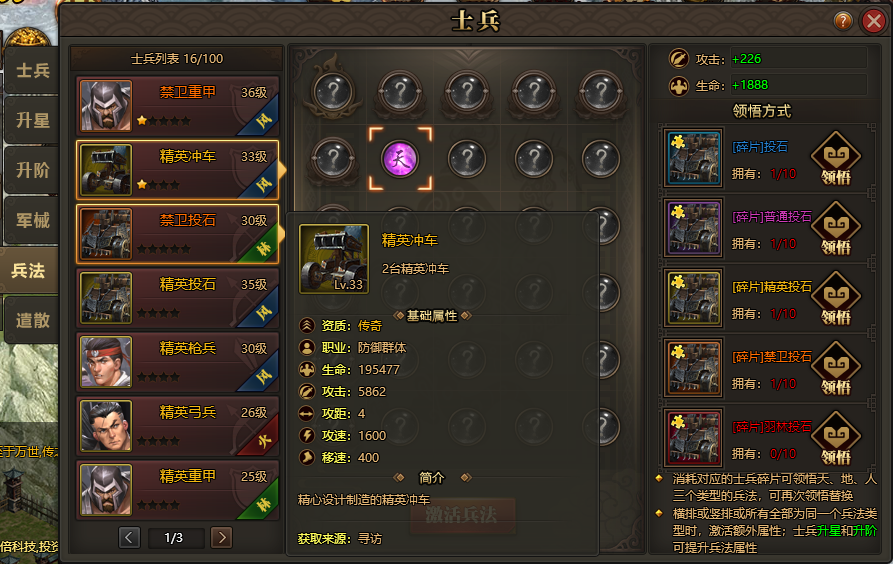 例如士兵羽林投石,想要领悟其兵法,需要消耗10个投石类碎片,从普通投石碎片到羽林投石碎片,碎片品质越高,领悟兵法的属性也越高。