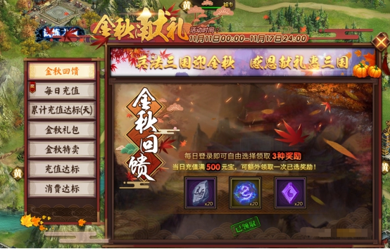 l 当日充值满500元宝,可额外领取一次已选奖励。