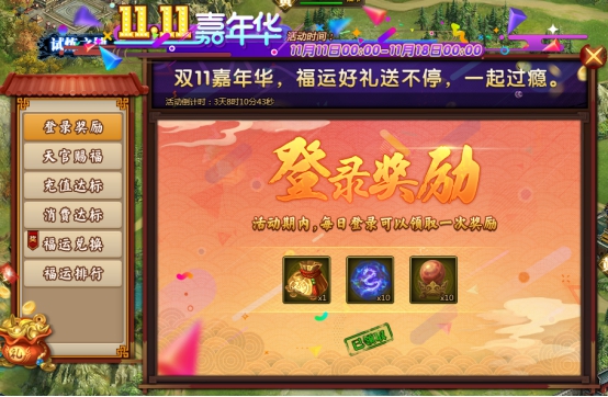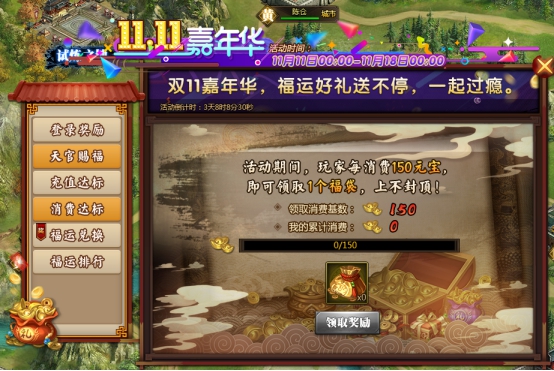 l 活动期间累积福运进行排行,可获得专属称号及丰富道具奖励福运越多,排名越高,截止11月18日0:00后可领取奖励;