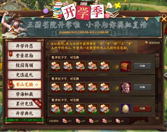 l 活动期间每充值50元宝,即可领取一个书山礼包(随机),上不封顶。书山礼包(随机):随机开出开(概率25%)、学(概率25%)、那(概率25%)、点(概率17%)、事(概率8%)其中1字。