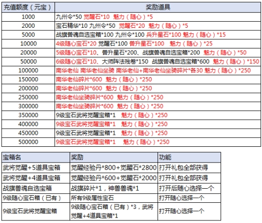 l 活动期间,充值达标即可领取对应奖励。具体对应档次奖励情况: