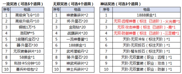 l 奖池分为一流、无双、神话3种 ,玩家每天可在3种奖池中选取分别选取5(一流)、4(无双)、3(神话)个道具来组成奖励转盘进行抽奖,每天仅一次自选次数,奖池情况如下: