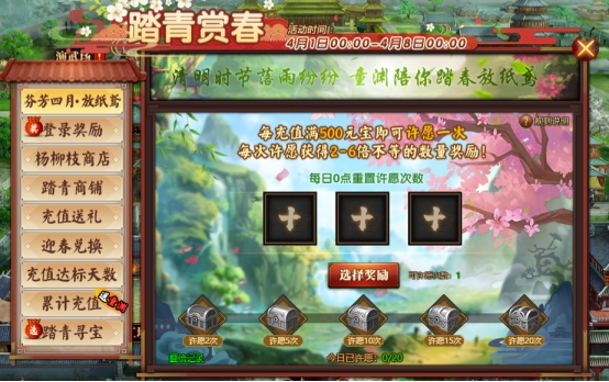 l 当日每充值满500元宝,可额外领取一次奖励,许愿可获2-6倍不等的奖励;