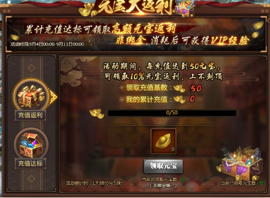 1.活动期间,每充值达到50元宝,可领取10%元宝返利,上不封顶;