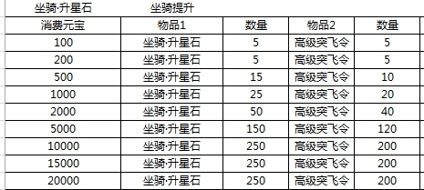 1.活动期间,每日累积消费达标可获得坐骑升星石和高级突飞令奖励。