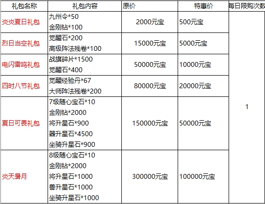 l 活动期间可购买超值优惠大礼包,具体对应礼包内容情况: