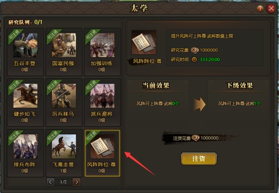 专为尊武将准备的特殊阵位,可在太学府研究,研究完成后就能将尊武将安排上阵。(此阵位科技研究不与传统阵位科技研究冲突,尊阵位研究完成后,即永久增加武将上阵数量)