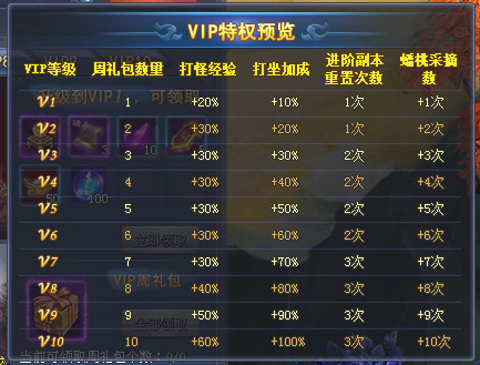 2、在提升至相应的VIP等级后,玩家们可以领取到丰厚的VIP礼包,同时还可以每周领取周礼包,不同等级的VIP同样也享有不同的VIP特权