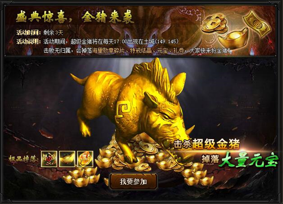 【活动内容】活动期间,超级金猪将在每天17:00出现在盟重要塞(149.145),击杀超级金猪将会掉落海量材料、元宝、礼券、特戒结晶,大家快来抢金猪!(注:金猪掉落无归属)