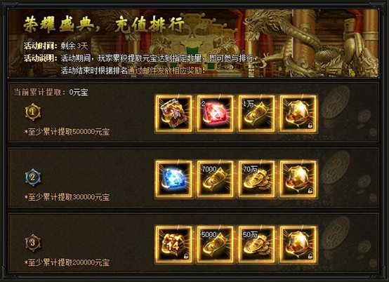 【活动内容】活动期间,玩家累积充值达到要求即可进入充值排行,在活动结束后根据排名获得相应奖励!(注:奖励通过邮件发放)
