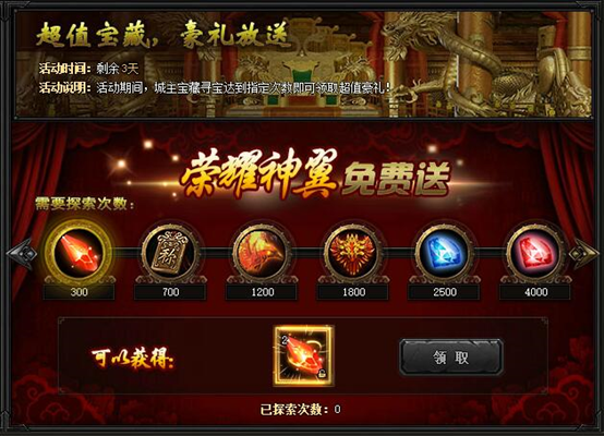 【活动内容】活动期间,城主宝藏寻宝达到指定次数即可领取超值豪礼!