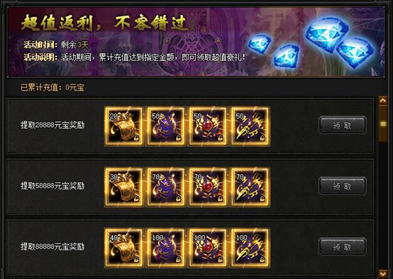【活动内容】活动期间,累计充值达到指定金额,即可领取超值豪礼!