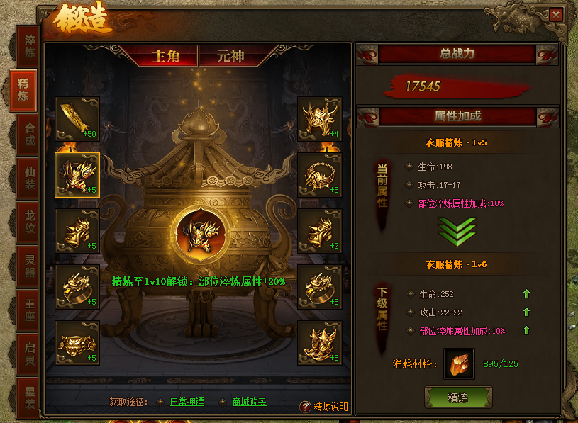 提升精炼等级可激活该部位的淬炼属性百分比提升