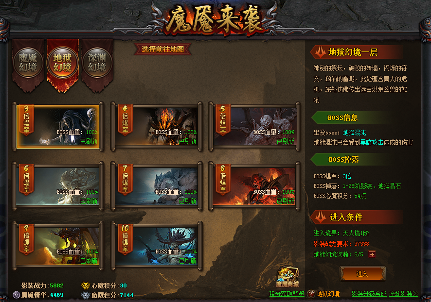 5、击杀地狱幻境boss会获得大量的心魔积分,层数越高积分越高