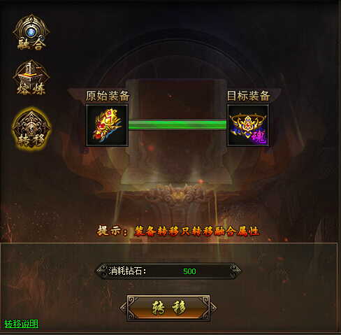 装备转移虽然是100%成功的,但是还是会花费一定的钻石,最低等阶的融合转移也需要500钻石,500钻石虽然不多,一般很快就可以打到。但是如果频繁转移,也是需要花费很多的。