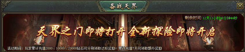 特玩网页游戏创世天界之门即将打开,全新探险即将开启,为了迎接新的挑战,游戏开服满7天的玩家,将会开启备战天界活动,活动期间玩家每日登陆、充值、都可以领取大量奖励。
