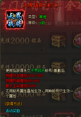 累计充值10000钻石:超·转生宝箱*15 创世圣石*3 强化石*30 超级宝石随机包*6