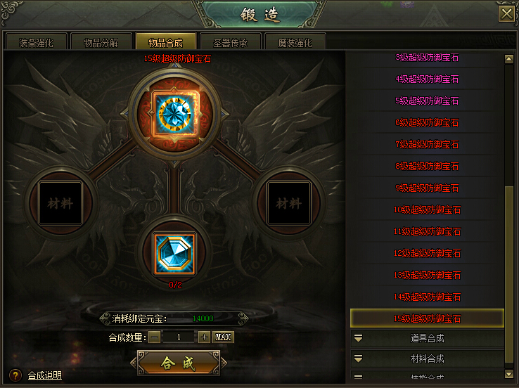 玩家可以在锻造-物品合成界面进行宝石合成,每2个相同的宝石即可合成更高一阶的宝石,2个一级超级攻击宝石可以合成1个2级超级攻击宝石,其他等级依此类推。一个15级的宝石需要16384个一级宝石进行合成。