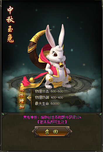 中秋玉兔激活后角色属性可以提高: