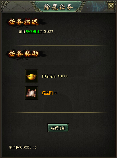 降妖除魔:双倍领取任务奖励消耗188钻石,白银特权8折领取,10次免费,奖励100000绑定元宝、藏宝图*1,30、50、50、80钻石购买次数,越来越多。重要程度:★★★☆☆