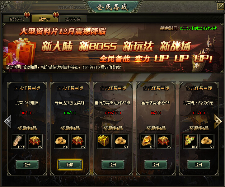 网页游戏全民备战战力UP活动中,玩家将游戏的各个系统升级到一定等级即可获得大量的材料奖励。不是每个任务目标都是非常容易达到的,玩家可以选择部分目标进行完成,土豪玩家当然也可以全部完成。
