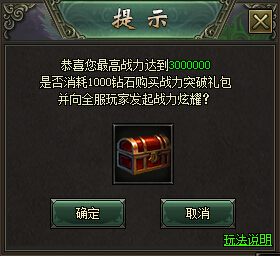 3.战力炫耀需花费钻石,玩家可选择进行炫耀或者放弃炫耀,每次炫耀,角色可立即领取与小小钻石等价值的礼包奖励。