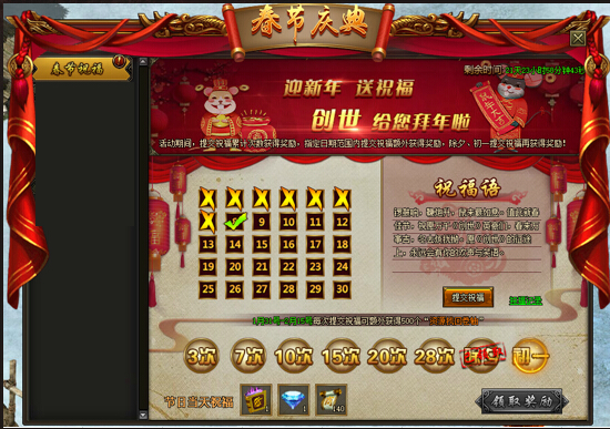 累计祝福20次:如意碎片*50、羽毛*100、5000创世币*25、创世圣石*5、鼠你最好运(15天)