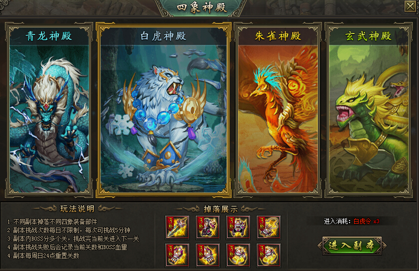进入四象神殿需要消耗青龙令、白虎令、朱雀令、玄武令,消耗青龙令*3可以进入青龙神殿,其他白虎、朱雀、玄武同理。