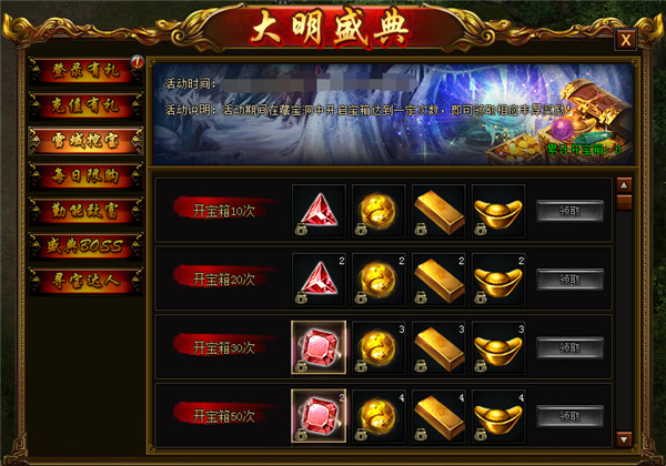 【活动说明】:活动期间在藏宝洞中开启宝箱达到一定次数,即可领取相应丰厚奖励!