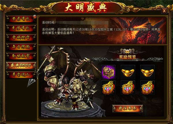 【活动说明】:活动期间每天12点30和18点30在阳关土城(128,107)刷出活动怪物,将其击杀将掉落大量极品道具!