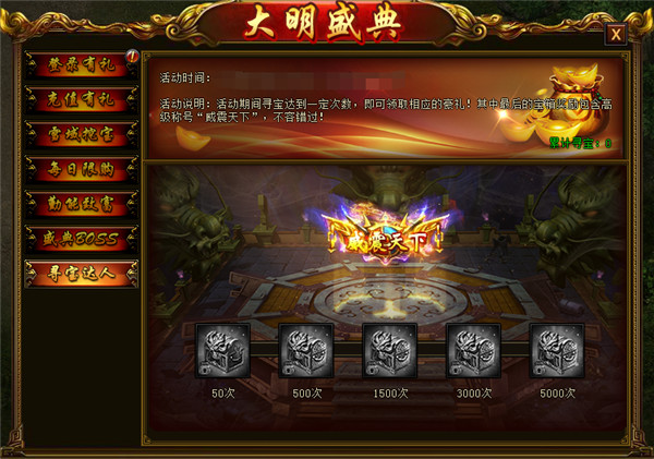 【活动说明】:活动期间寻宝达到一定次数,即可领取相应的豪礼!其中最后的宝箱奖励包含高级称号“威震天下”!