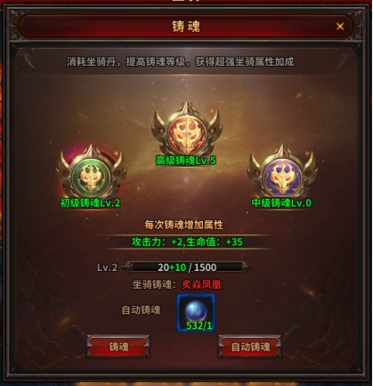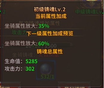 (2)使用多余的坐骑丹可提高铸魂等级,获得大量坐骑属性加成