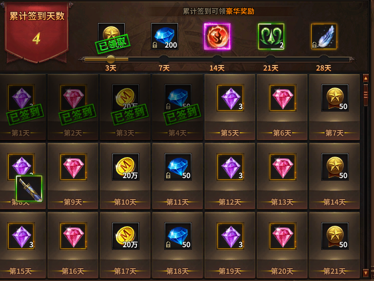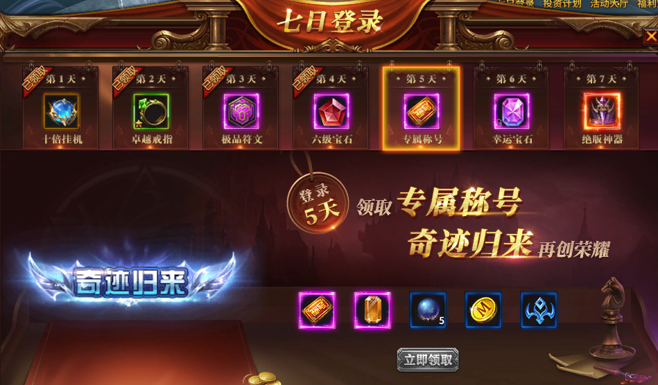 每天免费的东西除了每日签到还有七日登录和每日活跃度奖励,七日登录可以获得的道具有十倍挂机圣水、1星卓越戒指、紫色极品符文、六级宝石、专属称号、幸运宝石、绝版神器。其中称号幸运宝石和神器都是非常给力并且很难获得的。