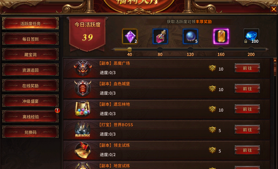 每日活跃可以免费领取到祝福宝石、生命宝石、1.5倍经验药水、5个坐骑丹以及100绑钻。