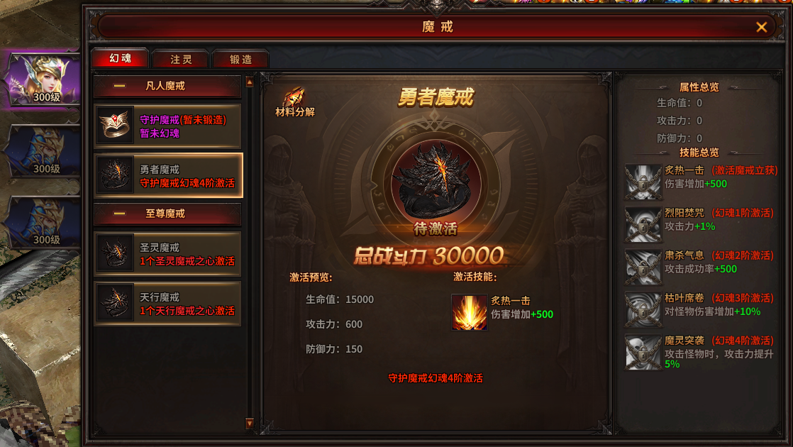 1) 魔戒分为凡人魔戒和至尊魔戒两种类型。功能开启时默认激活凡人魔戒中的守护魔戒并获得对应的属性加成;