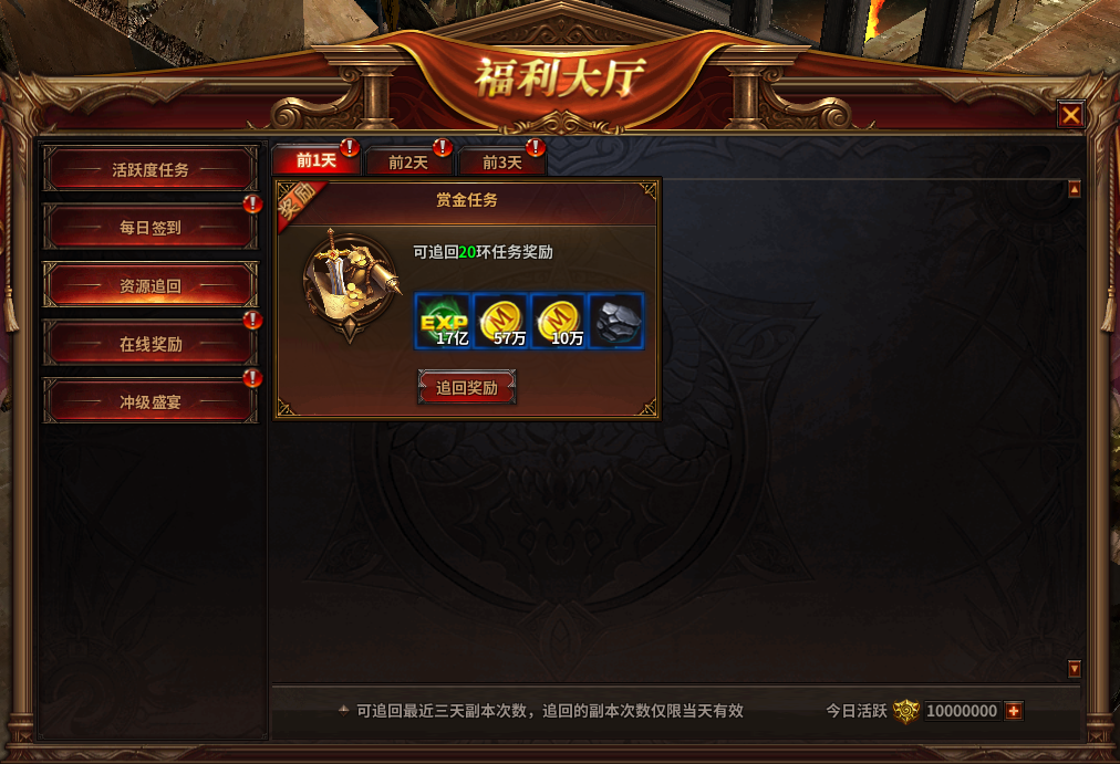 在资源追回活动中,玩家可以消耗活跃度、钻石或者绑钻追回前三天未使用的活动次数或奖励。