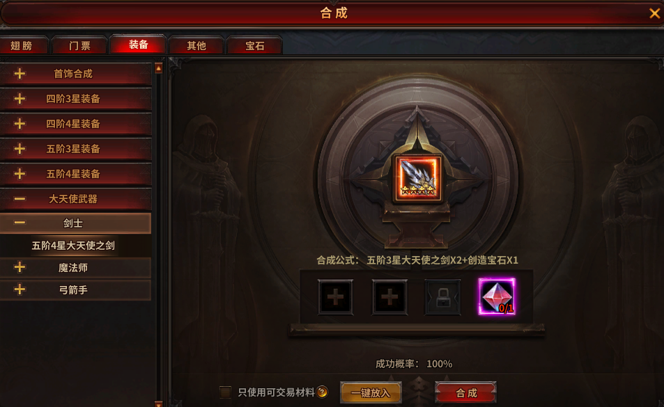 五阶3星大天使之剑×2+创造宝石×1可以合成五阶4星大天使之剑