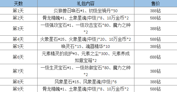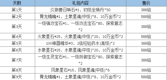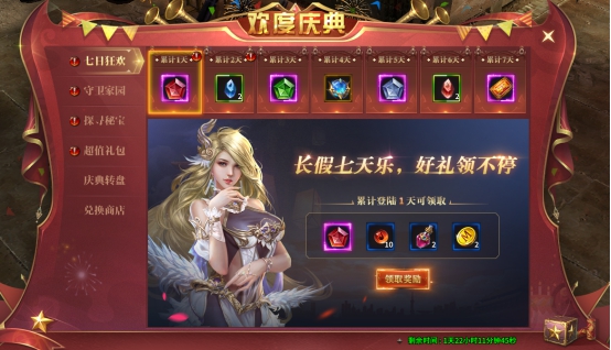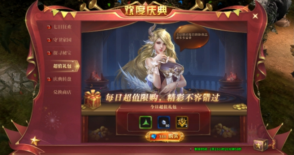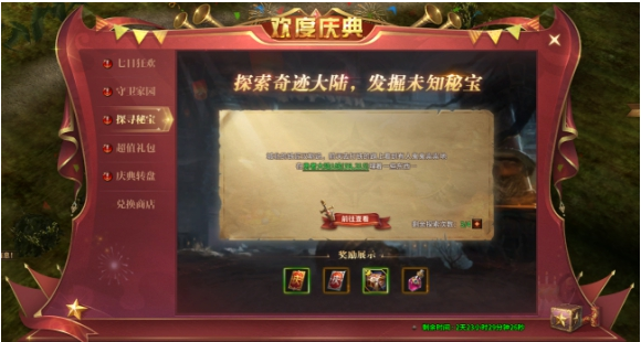 七日狂欢、守卫家园、探寻秘宝、超值礼包开启时间为: