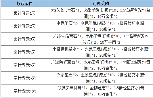 1、七日狂欢 (1)活动期间,累计登录天数达到要求即可领取奖励,累计登录7天有绝版活动称号【欢度庆典】免费赠送!走过路过不要错过啦~