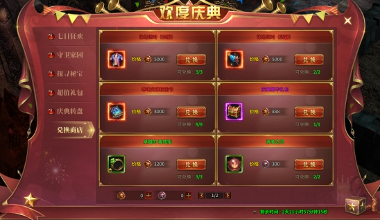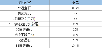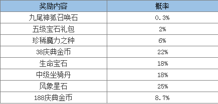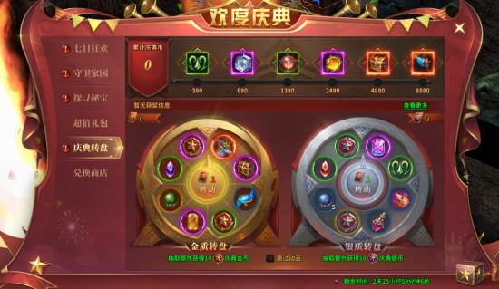 (2)每次转动转盘,可随机获得转盘中的一项奖励,并根据转动的转盘额外获得庆典金币或庆典银币,庆典金币和庆典银币还可以在兑换商店中兑换商品;