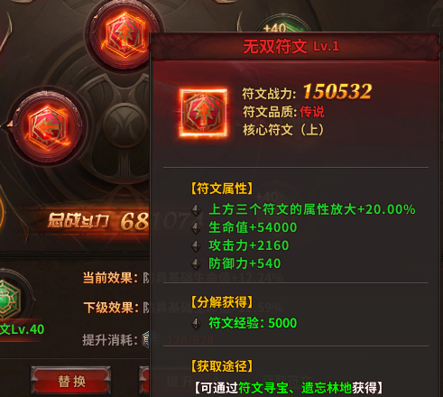 获得符文之后,可以点击角色按钮,找到符文界面,佩戴符文。佩戴后的符文可以用符文经验来提升符文等级,获得更多的属性,符文经验通过分解符文分解获得。