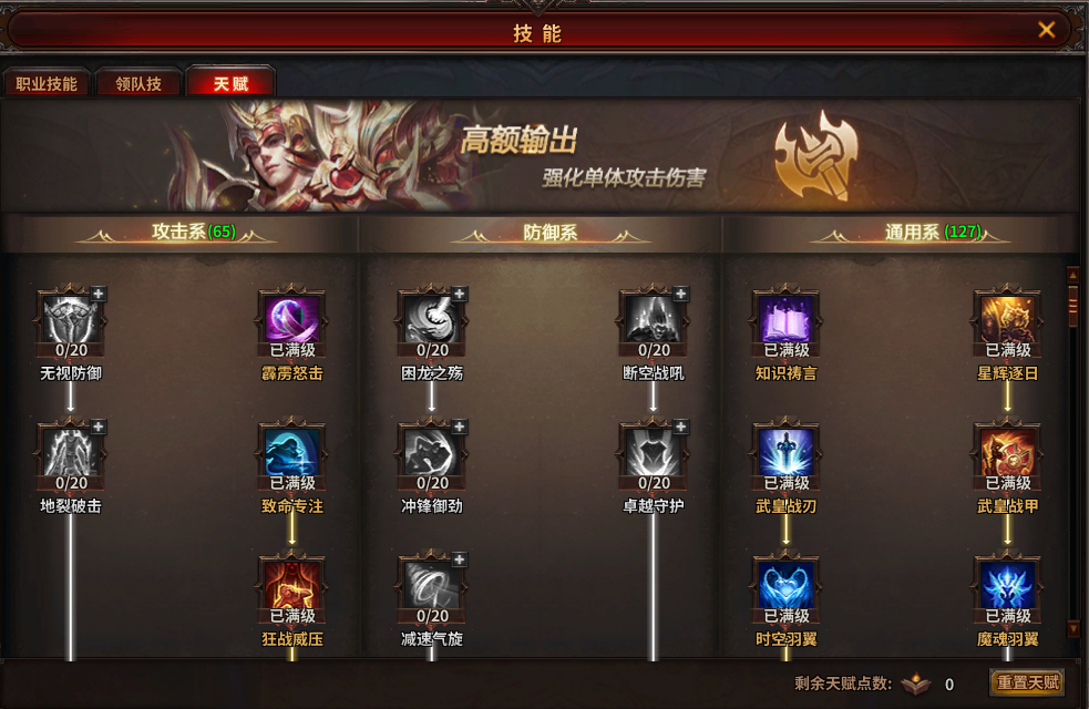 首先,暗黑大天使这款游戏,等级决定一切,我们首先要点满的是通用天赋里的【知识祷言】,然后是攻击系天赋里的【霹雳怒击】【黑龙咆哮】【五重烈箭】,无论什么职业搭配,优先花40点点满这两个天赋。