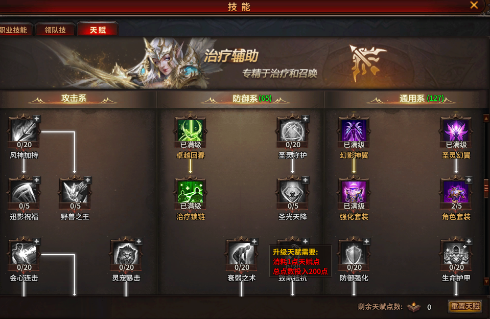 通过上图我们可以发现,每个角色并不是只能点一个系,例如辅助弓防御系天赋【衰弱之术】需要总点数投入200点,而点满防御系也不够200点,我们就可以按照上图的点法来点,通用系点上,防御系按照技能需求点,扛BOSS点左边,PK点右边。辅助弓箭手一般没有什么争议,都是这样点,有生存,能辅助。