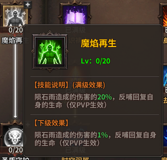 值得一提的是,防御天赋中有些很实用的点,我们也可以单独把他点出来,例如法师的【魔焰再生】,陨石20%回血,在PK中是很实用的天赋,并且没有前置。