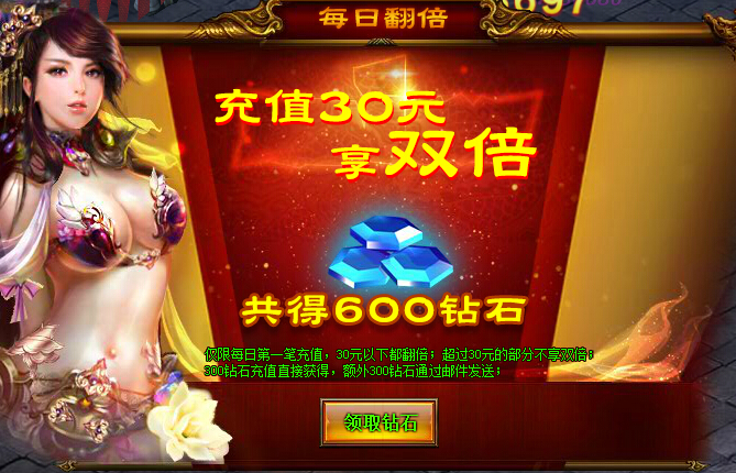 每日翻倍活动规则:充值翻倍仅限每日第一笔充值,30元以下都翻倍;超过30元的部分不享双倍;300钻石充值直接获得,额外300钻石通过邮件发送;