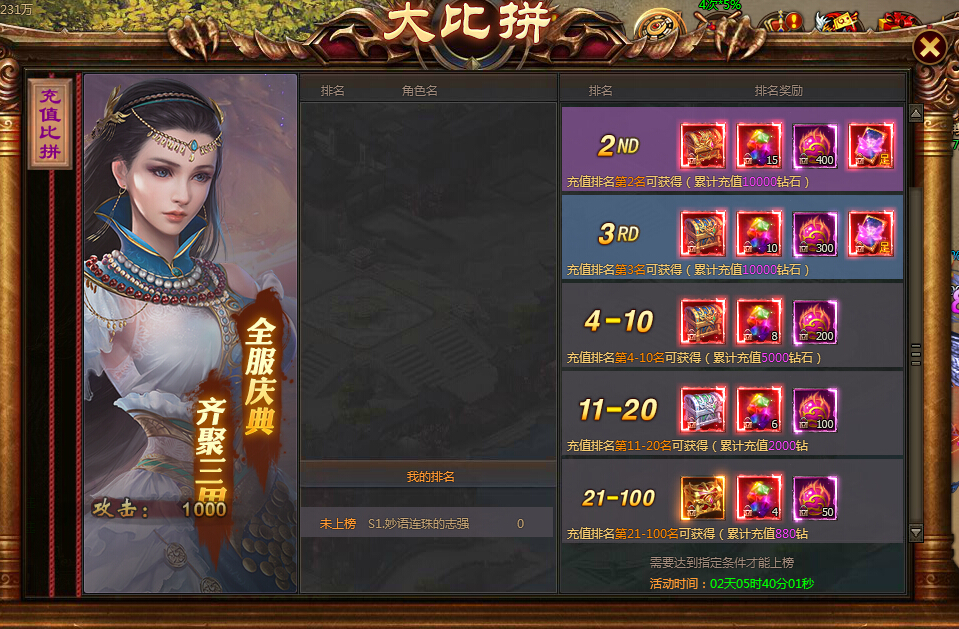 第2名(10000钻石):33阶装备自选宝箱、战意精华*15、万能进阶丹*400、足迹幻化皮肤