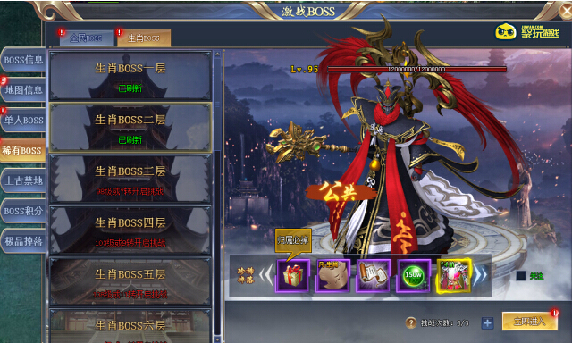 当福利BOSS已经不能满足我们的战力时,可以来试试挑战生肖BOSS,这里的BOSS更为强大!既然是挑战就不可避免有竞争者,展现你真正的实力,击败那些抢你机缘的竞争者独霸BOSS奖励!