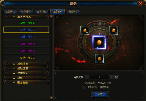 物品合成 物品合成功能中,可以让玩家进行宝石和各类材料的合成操作 低级宝石合成高级宝石 低级材料合成高级材料