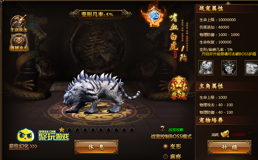 接下来是战宠,战宠是前期打boss的绝对主力,尽快升级满然后买满麻痹和加速绝版,灵宠100元上龙可以增加宠物30万伤害这个很可观,另外神魂最好增加50%伤害这个后期可以返还166666钻。