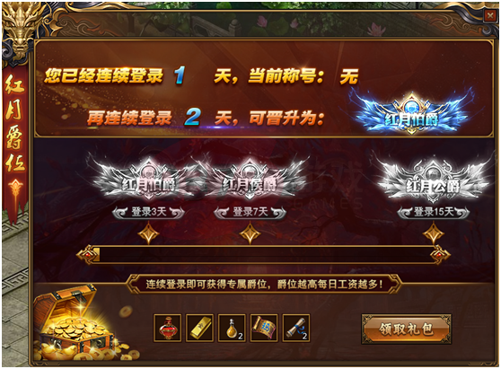 ,连续登陆即可获取爵位,加官进爵,盛名在外,日进斗金,全靠坚持,相信自己,你可以。